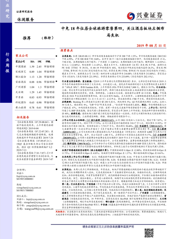 【兴业证券】【20190811】中免18年位居全球旅游零售第四,关注酒店板块左侧布局良机-15页 行业研究