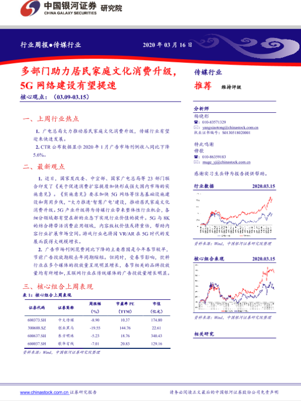 【银河证券】【20200316】20200316-中国银河-传媒行业周报:多部门助力居民家庭文化消费升级,5G网络建设有望提速-25页 行业研究