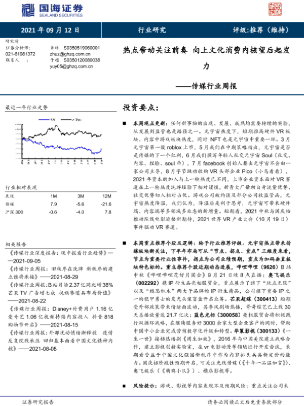 【国海证券】【20210912】传媒行业周报:热点带动关注前奏 向上文化消费内核望后起发力-19页 行业研究