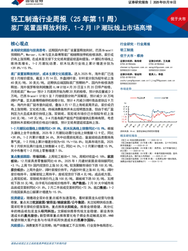 【国信证券】【20250318】20250318-国信证券-轻工制造行业周报(25年第11周):浆厂装置面释放利好,1-2月IP潮玩线上市场高增-19页 行业研究