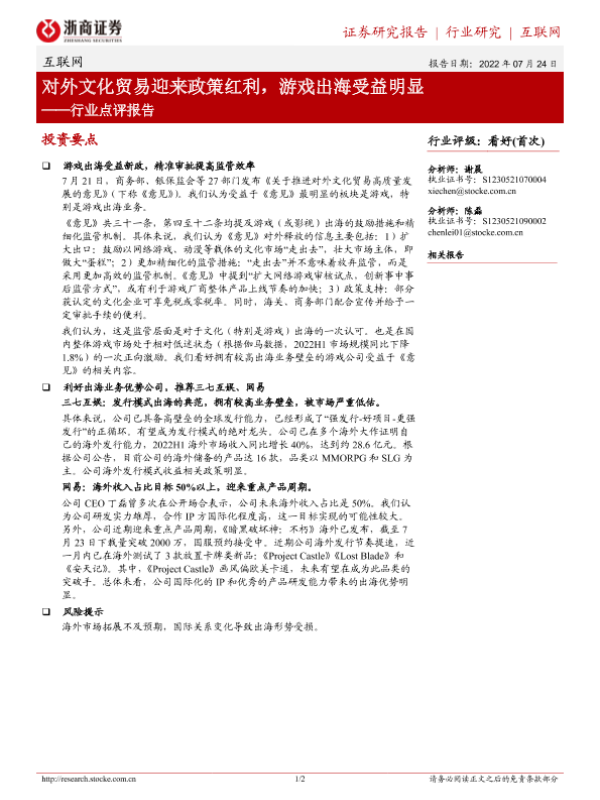 【浙商证券】【20220724】对外文化贸易迎来政策红利,游戏出海受益明显-2页 行业研究