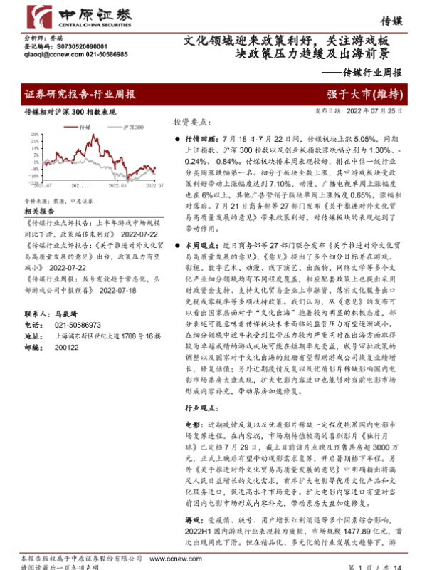 【中原证券】【20220725】传媒行业周报:文化领域迎来政策利好,关注游戏板块政策压力趋缓及出海前景-14页 行业研究
