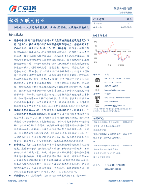 【广发证券】【20220721】推进对外文化贸易高质量发展,滴滴处罚落地,政策稳健预期强化-10页 行业研究