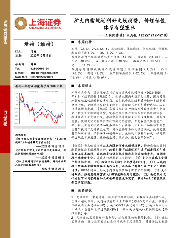 【上海证券】【20221219】互联网传媒行业周报:扩大内需规划利好文娱消费,传媒估值体系有望重估-22页 行业研究