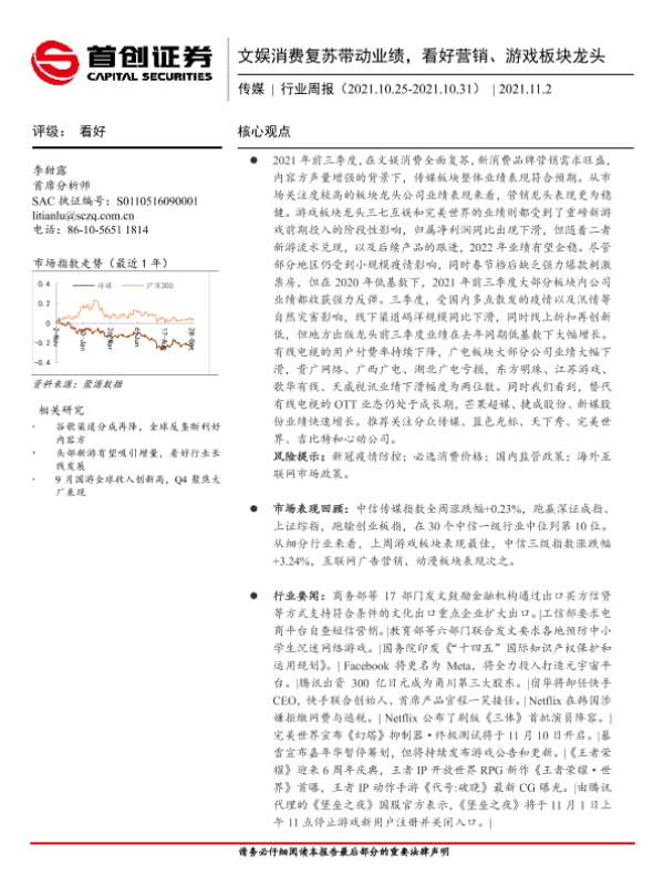 【首创证券】【20211102】20211102-首创证券-传媒行业周报:文娱消费复苏带动业绩,看好营销、游戏板块龙头-11页 行业研究