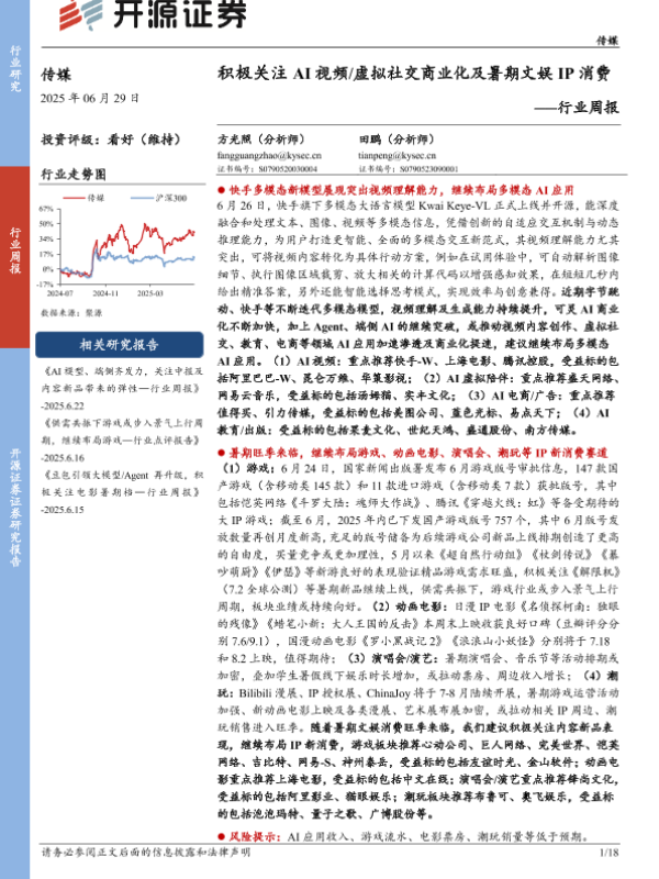 【开源证券】【20250629】传媒行业周报:积极关注AI视频 虚拟社交商业化及暑期文娱IP消费-18页 行业研究