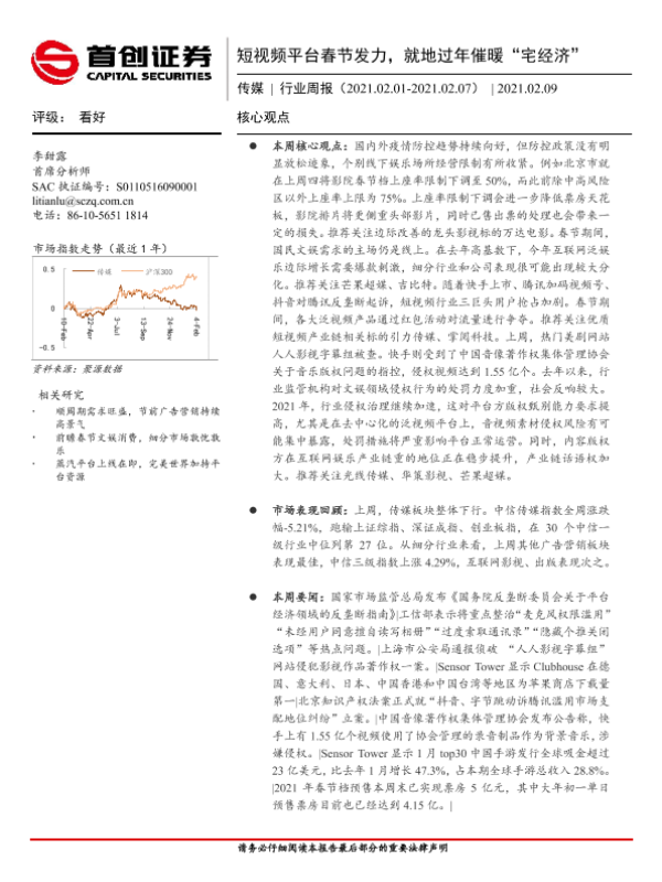 【首创证券】【20210209】20210209-首创证券-传媒行业周报:短视频平台春节发力,就地过年催暖“宅经济”-13页 行业研究