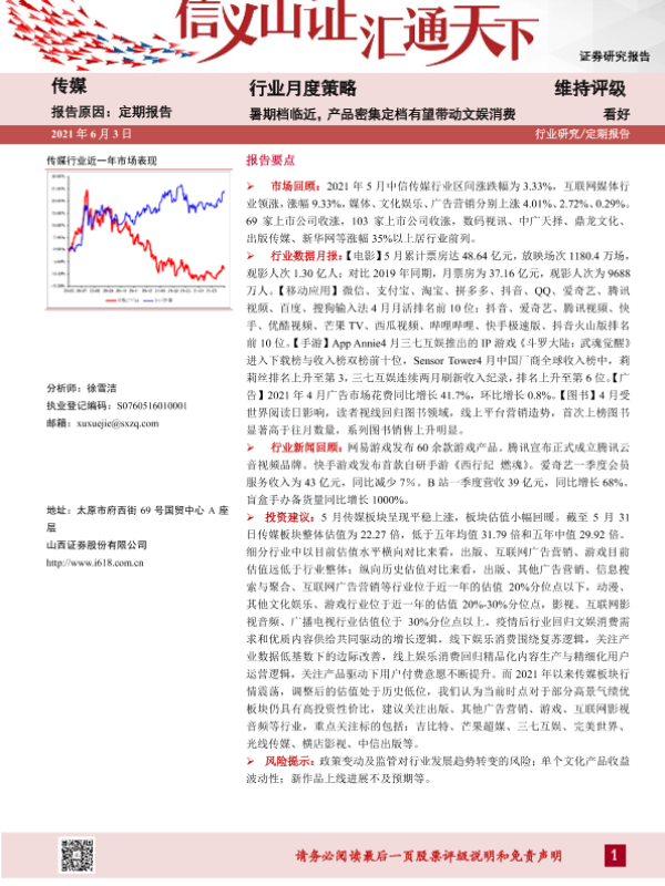 【山西证券】【20210603】20210603-山西证券-传媒行业月度策略:暑期档临近,产品密集定档有望带动文娱消费-25页 行业研究