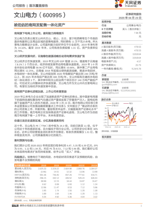 【天风证券】【20200423】20200423-天风证券-文山电力-600995.SH-被低估的南网发配售一体化资产-20页 行业研究