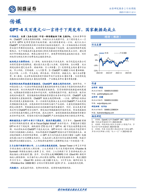 【国盛证券】【20230312】GPT-4及百度文心一言将于下周发布,国家数据局成立-10页 行业研究