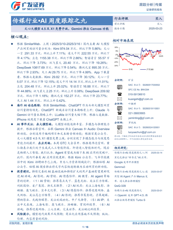 【广发证券】【20250323】传媒行业·AI周度跟踪之九:文心大模型4.5及X1免费开放,Gemini推出Canvas功能-18页 行业研究
