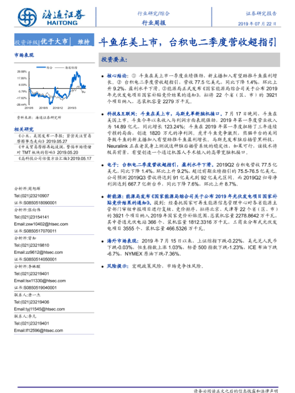 【海通证券】【20190722】20190722-海通证券-综合行业周报:斗鱼在美上市,台积电二季度营收超指引-7页 行业研究