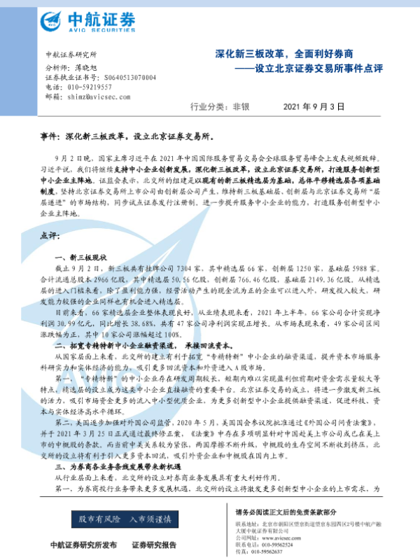 【中航证券】【20210903】设立北京证券交易所事件点评-深化新三板改革,全面利好券商-3页 证券期货研究报告