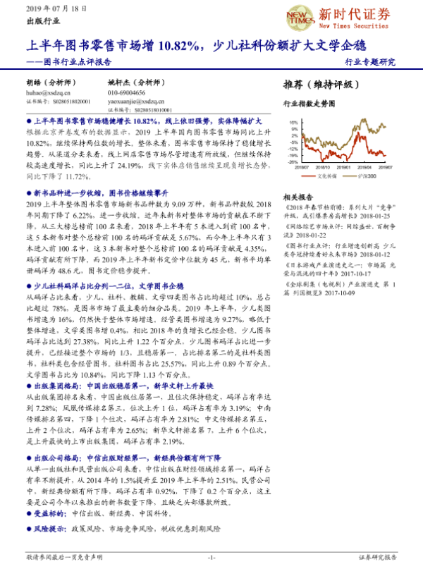 【新时代证券】【20190718】20190718-新时代证券-图书行业点评报告:上半年图书零售市场增10.82%,少儿社科份额扩大文学企稳-10页 行业研究