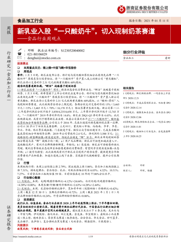 【浙商证券】【20210111】20210111-浙商证券-食品行业周观点:新乳业入股“一只酸奶牛”,切入现制奶茶赛道-19页 行业研究