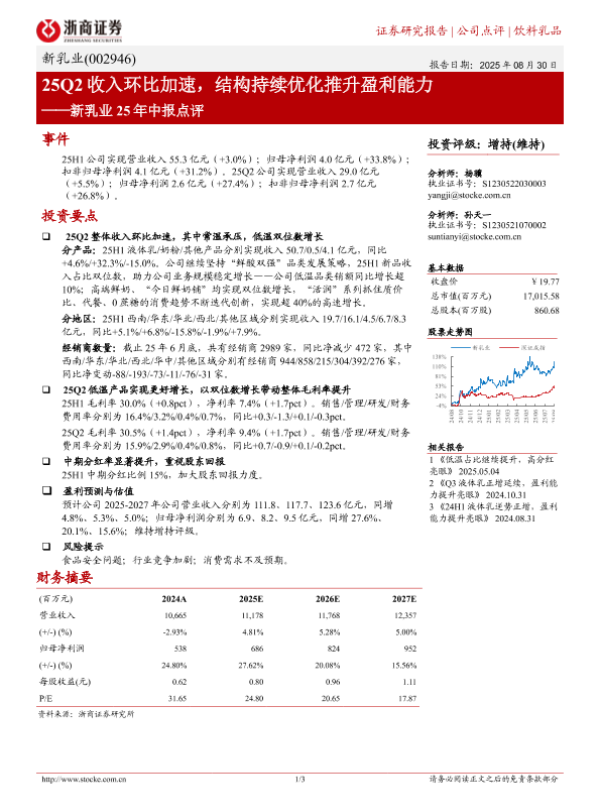 【浙商证券】【20250830】新乳业-25Q2收入环比加速,结构持续优化推升盈利能力-3页 证券期货研究报告