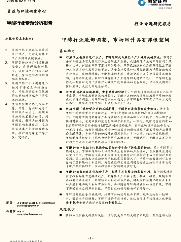 【国金证券】【20190212】甲醇行业专题分析报告:甲醇行业底部调整,市场回升具有弹性空间-20页 行业研究