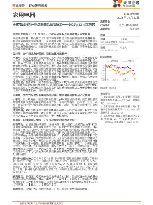 【天风证券】【20220322】家用电器2022W12周度研究:小家电品牌新兴渠道销售及运营解读-18页 行业研究