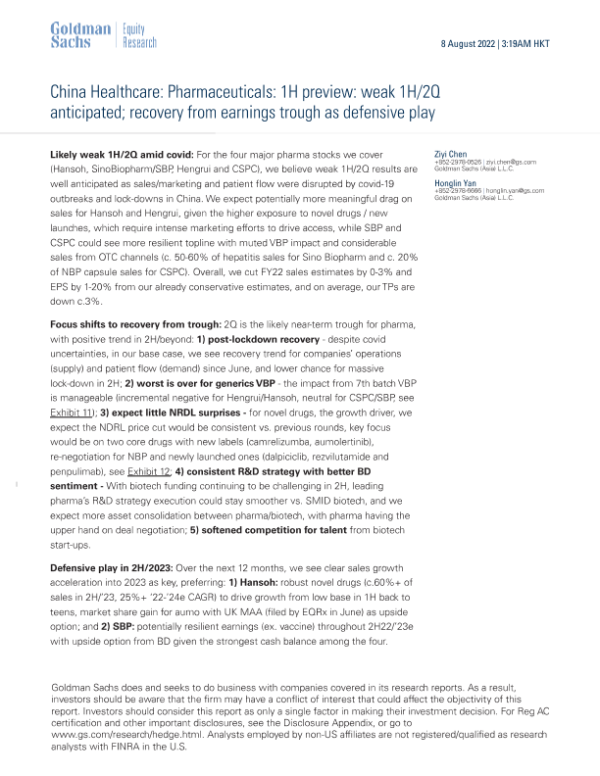 【Goldman Sachs】【20220808】弱于预期的2022年上半年/第二季度;作为防御性策略的业绩谷底复苏-18页 行业研究