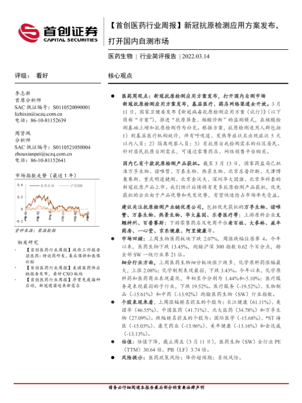 【首创证券】【20220314】首创医药行业周报:新冠抗原检测应用方案发布,打开国内自测市场-9页 行业研究