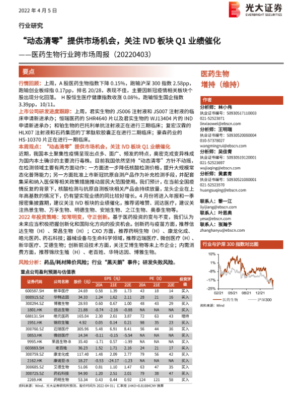 【光大证券】【20220405】医药生物行业跨市场周报:“动态清零”提供市场机会,关注IVD板块Q1业绩催化-27页 行业研究