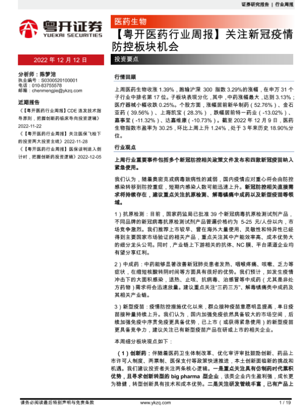 【粤开证券】【20221212】【粤开医药行业周报】关注新冠疫情防控板块机会-19页 行业研究