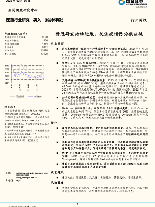【国金证券】【20220206】医药行业研究周报:新冠研发持续进展,关注疫情防治供应链-13页 行业研究