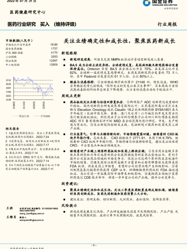 【国金证券】【20220731】医药行业研究周报:关注业绩确定性和成长性,聚焦医药新成长-22页 行业研究