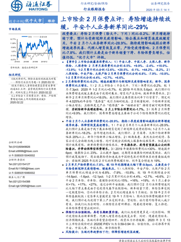 【海通证券】【20200314】上市险企2月保费点评:寿险增速持续放缓,平安个人业务新单同比-29%-6页 行业研究