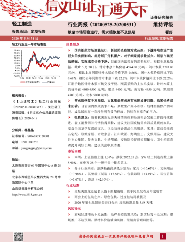 【山西证券】【20200531】20200531-山西证券-轻工制造行业周报:纸浆市场弱稳运行,需求端恢复不及预期-13页 行业研究