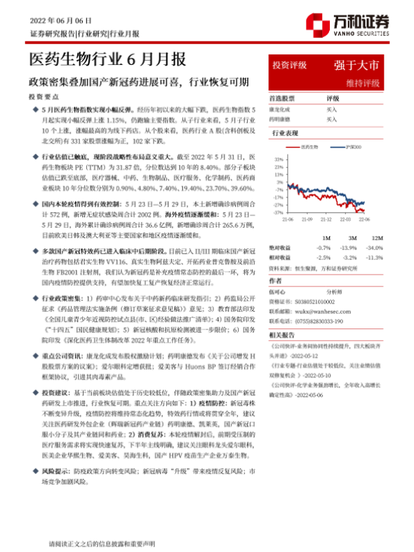 【万和证券】【20220606】医药生物行业6月月报:政策密集叠加国产新冠药进展可喜,行业恢复可期-16页 行业研究