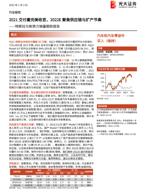 【光大证券】【20220103】2022交付量完美收官,2022E聚焦供应链与扩产节奏——特斯拉与新势力销量跟踪报告-4页 行业研究