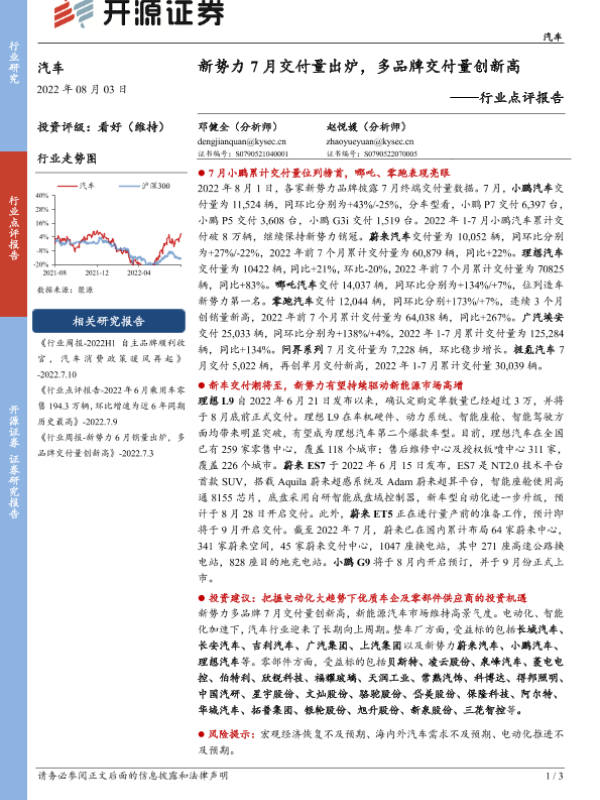 【开源证券】【20220803】新势力7月交付量出炉,多品牌交付量创新高-3页 证券期货研究报告