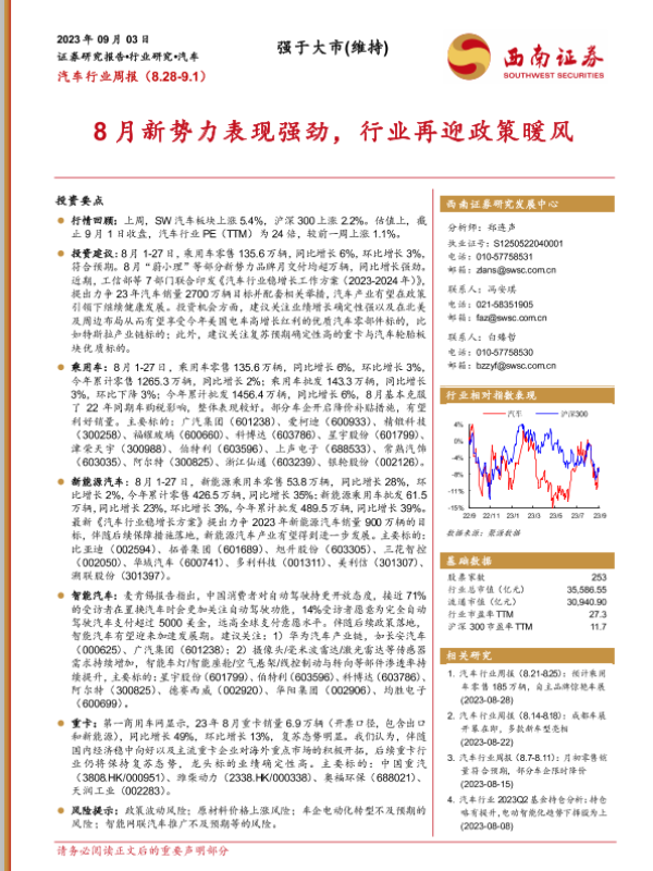 【西南证券】【20230903】汽车行业周报:8月新势力表现强劲,行业再迎政策暖风-17页 行业研究