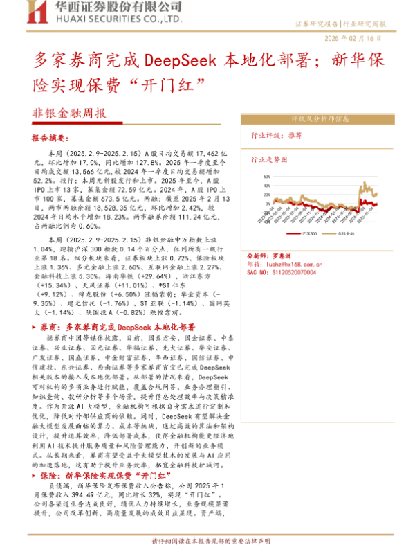 【华西证券】【20250216】非银金融周报:多家券商完成DeepSeek本地化部署;新华保险实现保费“开门红”-11页 行业研究