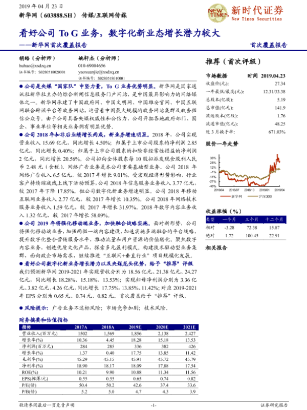 【新时代证券】【20190423】新华网首次覆盖报告:看好公司To G业务,数字化新业态增长潜力较大-22页 行业研究