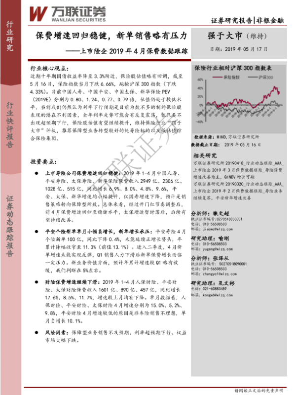 【万联证券】【20190517】上市险企2019年4月保费数据跟踪:保费增速回归稳健,新单销售略有压力-3页 行业研究
