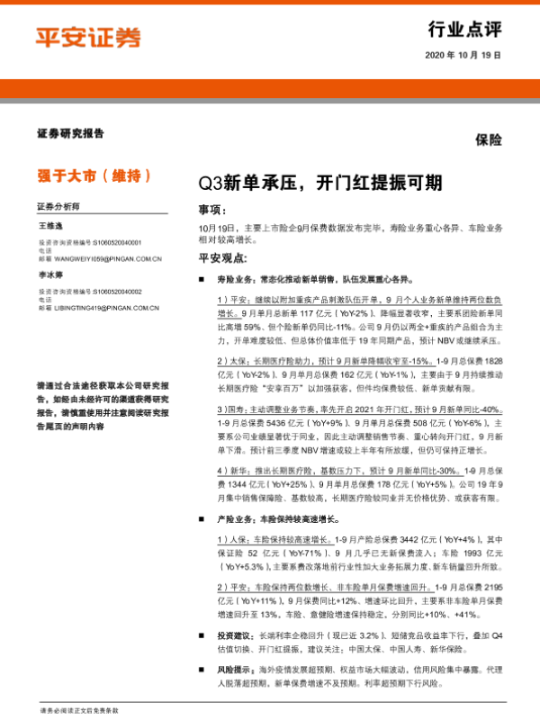 【平安证券】【20201019】保险行业点评:Q3新单承压,开门红提振可期-4页 行业研究