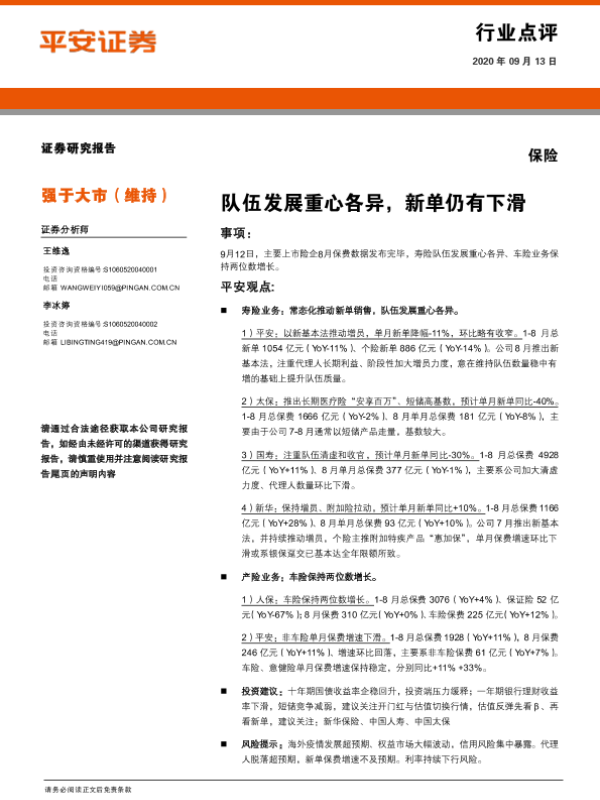 【平安证券】【20200913】保险行业点评:队伍发展重心各异,新单仍有下滑-4页 行业研究