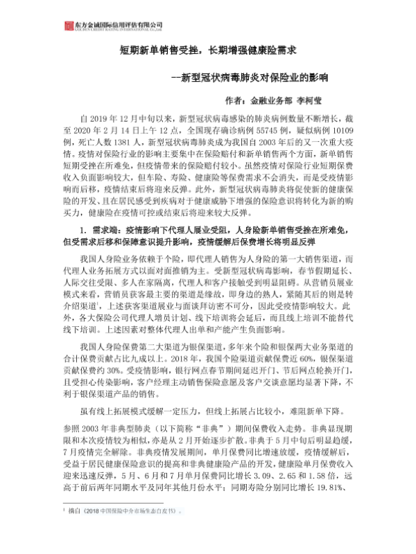 【东方金诚】【20200218】新型冠状病毒肺炎对保险业的影响:短期新单销售受挫,长期增强健康险需求-7页 行业研究