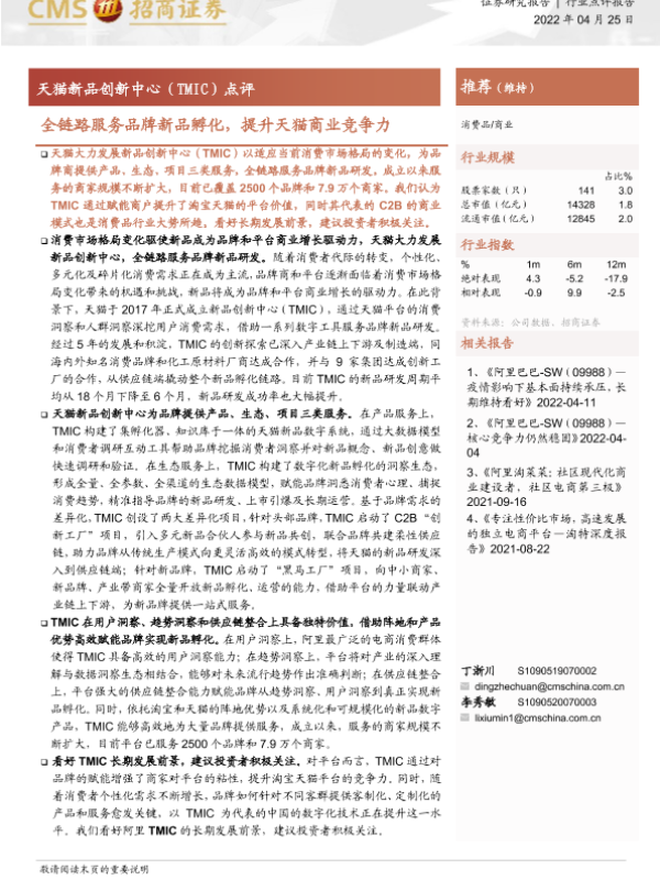 【海通证券】【20220425】天猫新品创新中心(TMIC)点评-全链路服务品牌新品孵化,提升天猫商业竞争力-3页 证券期货研究报告