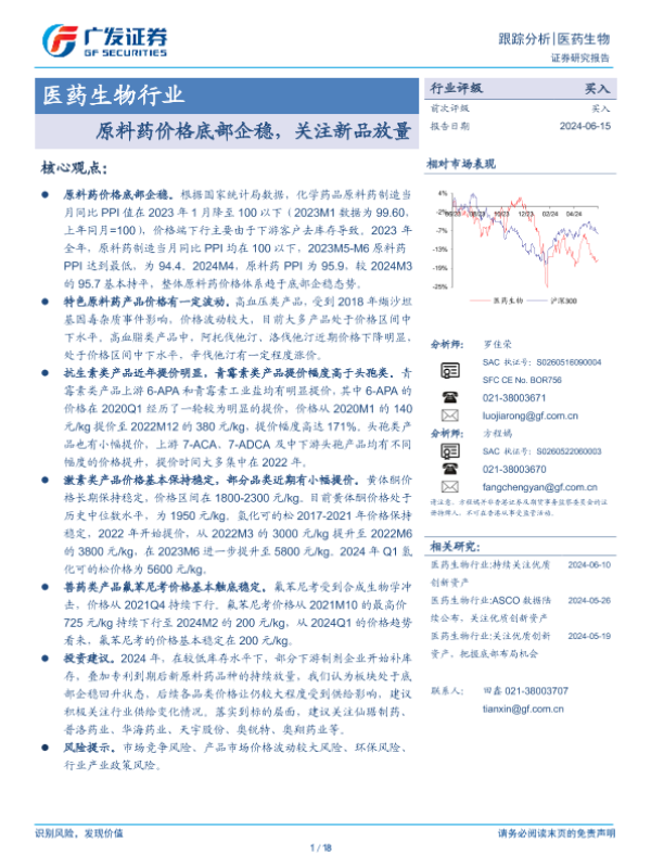 【广发证券】【20240615】医药生物行业跟踪分析:原料药价格底部企稳,关注新品放量-18页 行业研究