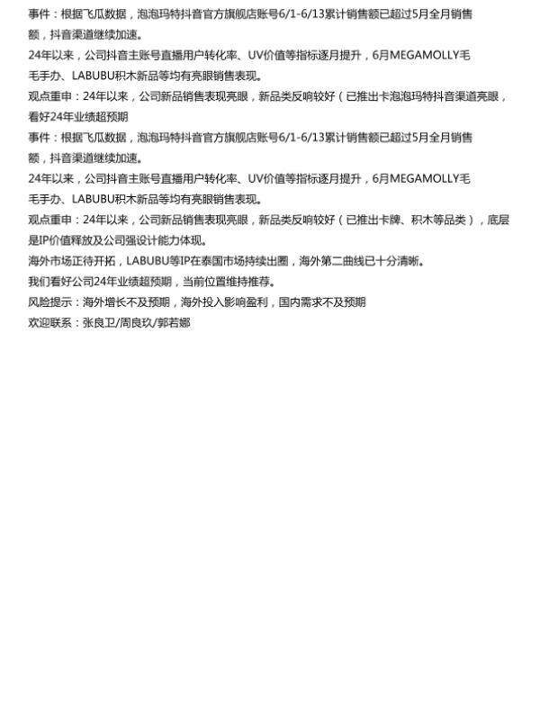 【泡泡玛特】【2024】泡泡玛特抖音渠道亮眼看好24年业绩超预期事件根据飞瓜数据-1页 行业研究