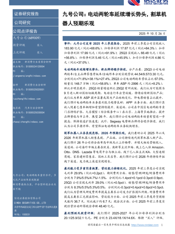 【信达证券股份有限公司 C INDA SECUR IT IES CO.<D】【202510】九号公司:电动两轮车延续增长势头,割草机器人预期乐观-5页 证券期货研究报告