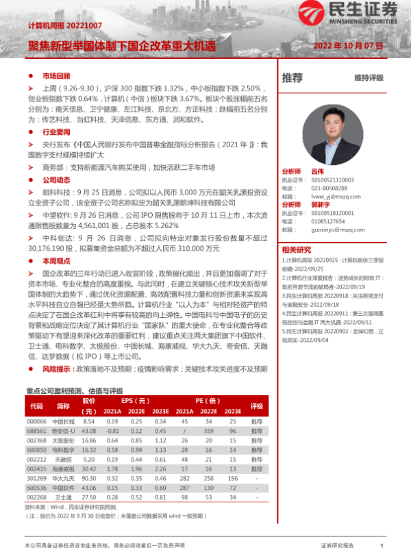 【民生证券】【20221007】计算机周报:聚焦新型举国体制下国企改革重大机遇-30页 行业研究