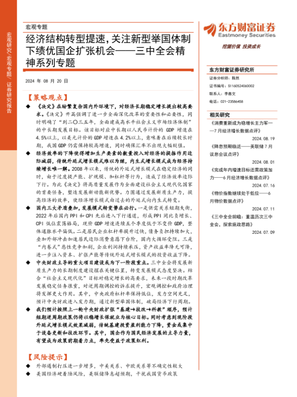 【东方财富证券】【20240820】三中全会精神系列专题:经济结构转型提速,关注新型举国体制下绩优国企扩张机会-20页 行业研究