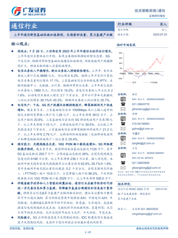 【广发证券】【20230723】20230723-广发证券-通信行业投资策略周报:上半年通信新型基础设施加速推进,长期看好流量、算力基建产业链-17页 行业研究