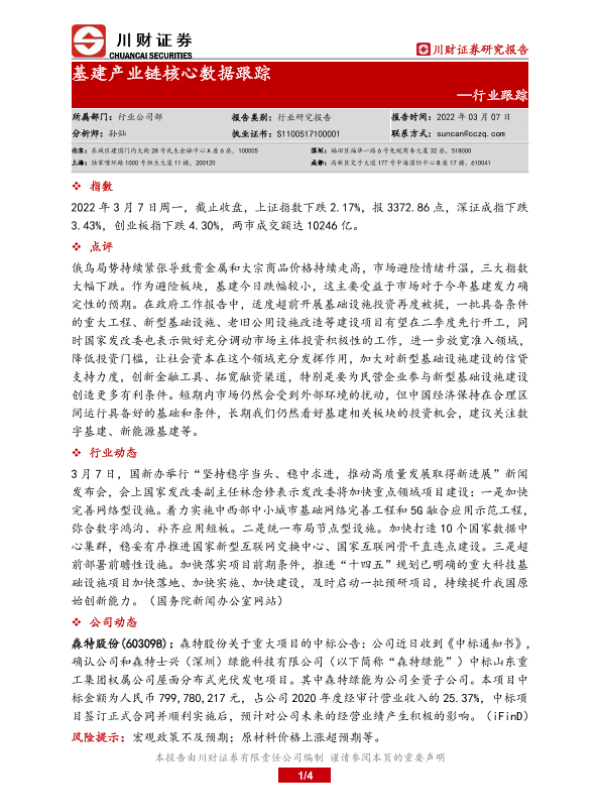 【川财证券】【20220307】基建产业链核心数据跟踪-4页 行业研究