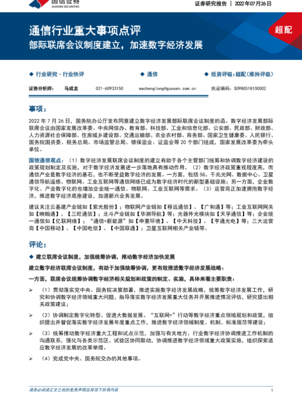 【国信证券】【20220726】通信行业重大事项点评:部际联席会议制度建立,加速数字经济发展-7页 行业研究
