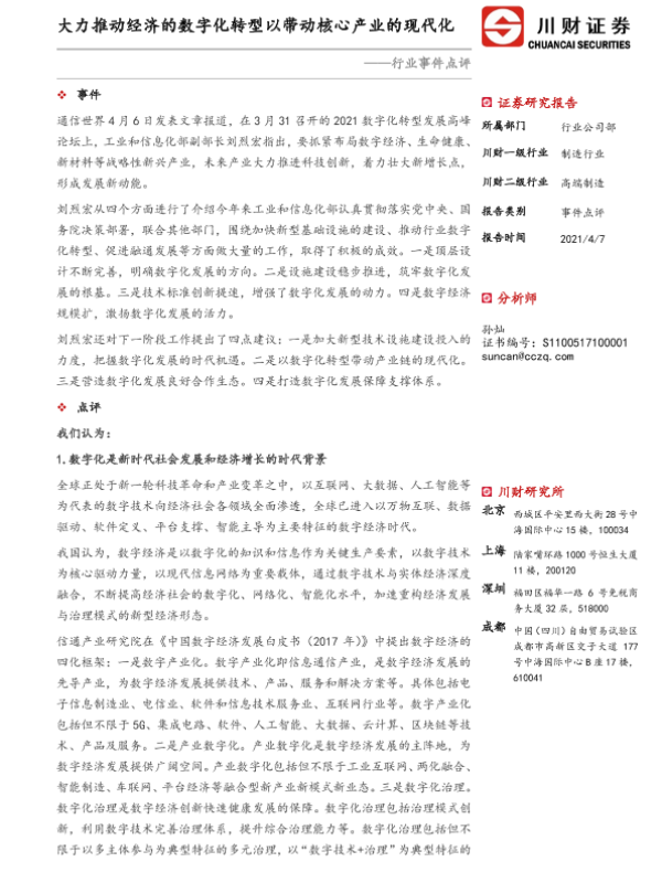 【川财证券】【20210407】大力推动经济的数字化转型以带动核心产业的现代化-3页 证券期货研究报告